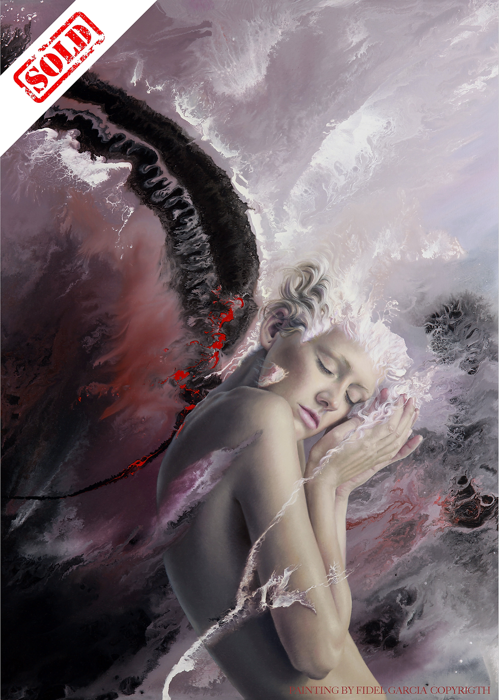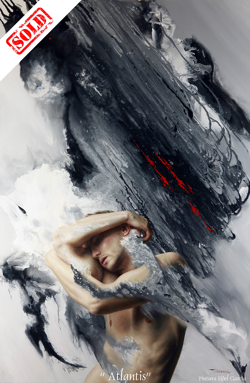 "The familiar and the fantastic collide vibrantly in the work of Fidel García. The painter fuses the visceral and the ethereal, juxtaposing the human body, photorealistically rendered, with colorful abstract expressionist forms. Sometimes, his nude figures—usually women, at times winged—melt from bold washes of color."